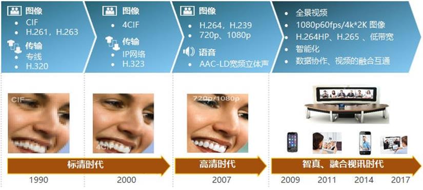二、从高清时代发展到智真、融合视讯时代:用户能够享受到全景视频、4K*2K图像,以及数据协作、视频的融合互通体验。