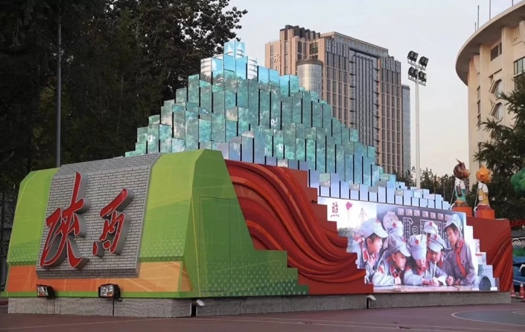 在陕西彩车上,利亚德为其打造了一块237.5平方米LED显示屏,呈现了秦岭、宝塔山和现代城市的造型变化,充分展示陕西生态文化、历史文化、红色文化、科技文化、创新文化,让全世界看到了一个新陕西。